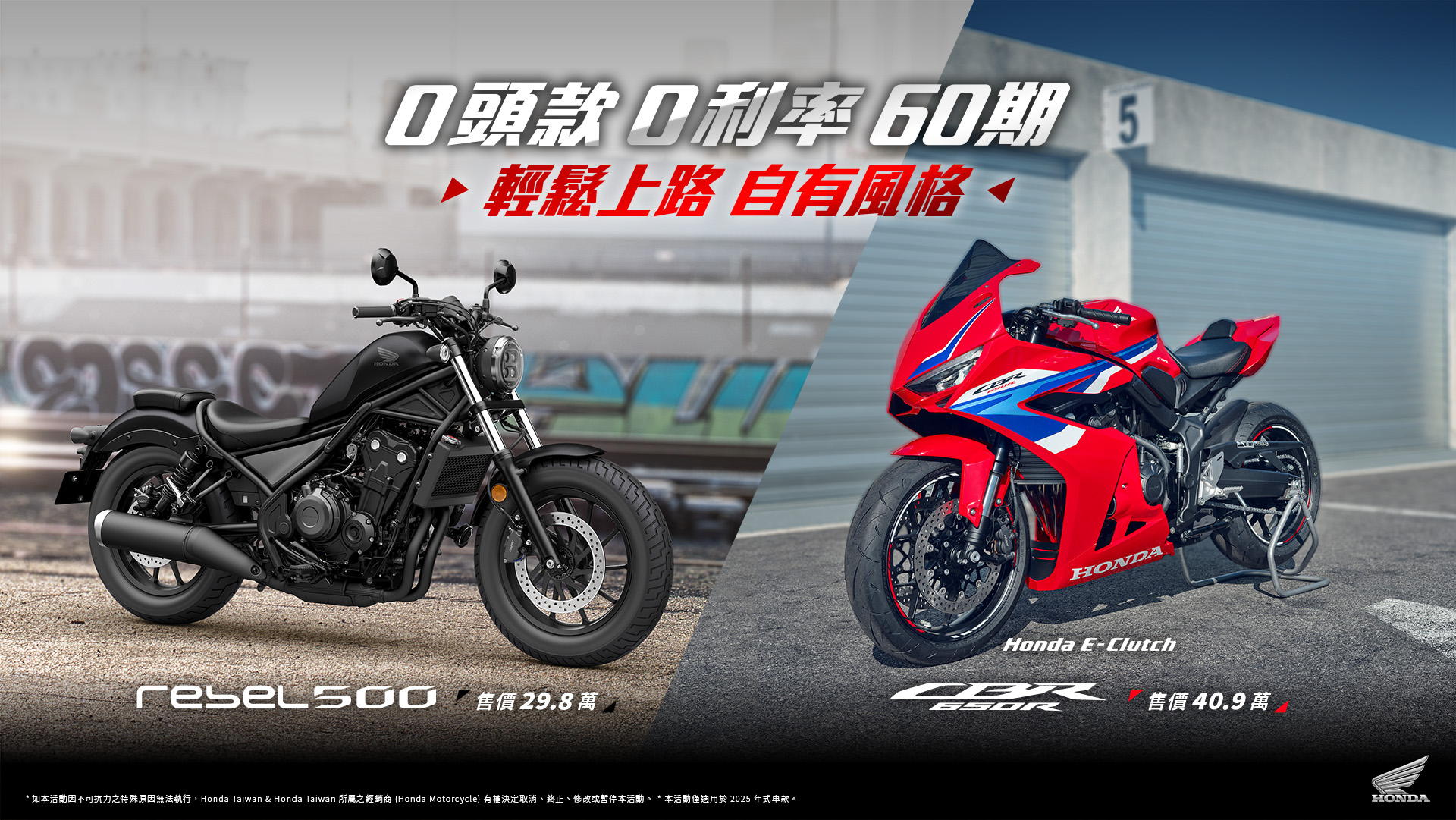 本月特別推出 「新年神開局 樂駕新動力」專案,購買2026年式指定Honda Motorcycle車款,即可享有一萬元專屬購車金,不論是日常通勤、假日出遊或冒險壯遊,讓顧客以更輕鬆的方式實現騎乘夢想,感受Honda所帶來的卓越性能與造車工藝。另外,針對搭載全新科技2025年式CBR650R E-Clutch以及經典美式巡航Rebel500,推出「輕鬆上路 自有風格」專案,兩款車款享60期、0頭款、0利率優惠,不論是結合簡約洗鍊的美式風格設計的Rebel500以低座高、或是承襲SPORTS車系動感外型的CBR650R E-Clutch,透過專屬的購車方案,陪伴每一位騎士迎向嶄新旅程。